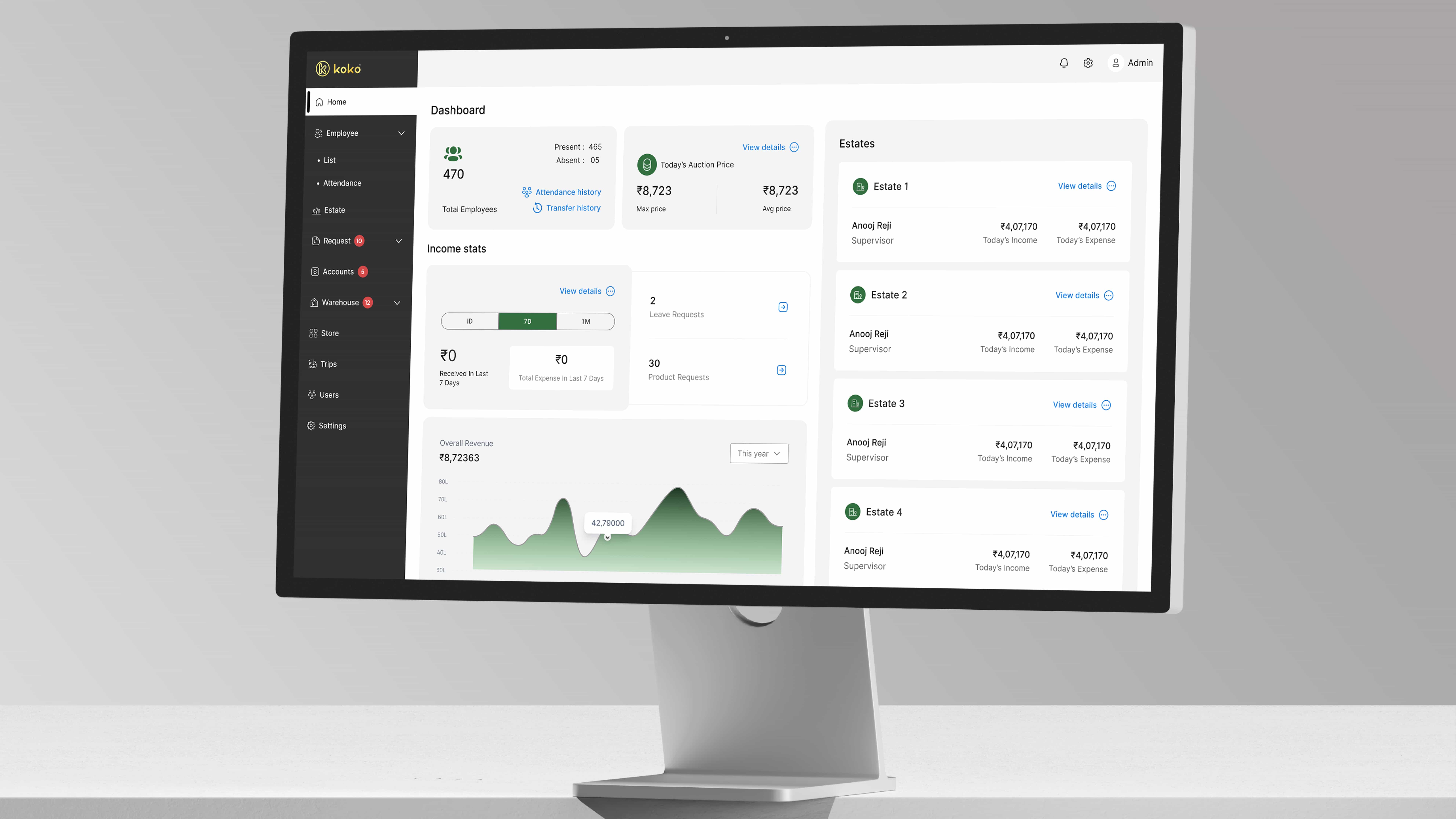 KOKO Spices helps manage spice farms. It makes it easy to track workers, stock, money, and deliveries with simple apps and dashboards.